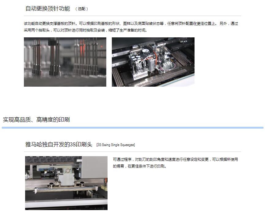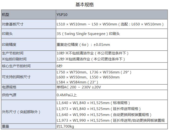 YSP10 高端印刷機1.印刷節拍時間達到世界更快水平,實現全自動化生產作業。2.超高速印刷性能 包括網板清潔作業:12sec/cycle / 10sec/cycle3.重復定位精度:6σ : ±0.01mm4.支持大型基板:L510 x W510mm [選購品: L650 x W510mm]5.網板尺寸:MAX.750×750mm