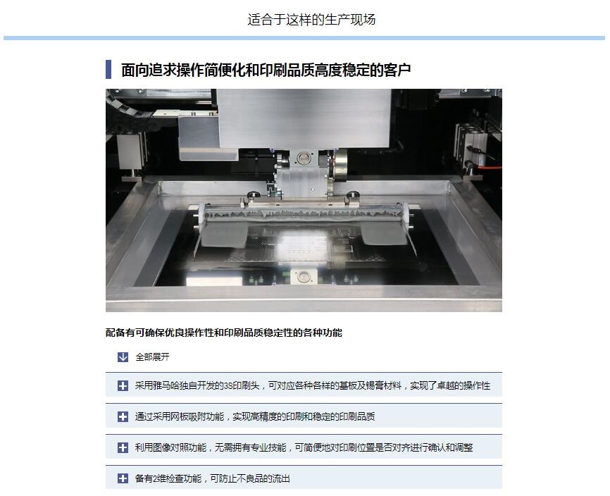 YCP10高性能小型印刷機(jī) 1.實(shí)現(xiàn)等同于上級(jí)機(jī)型的印刷質(zhì)量, 支持大型基板, 寬幅網(wǎng)板。2.承襲高端機(jī)的功能, 實(shí)現(xiàn)高精度, 高質(zhì)量的印刷。3.集高度通用性, 多功能于一體的小型機(jī)體。4.支持YAMAHA SMT生產(chǎn)線聯(lián)線功能, 實(shí)現(xiàn)高效生產(chǎn)。
